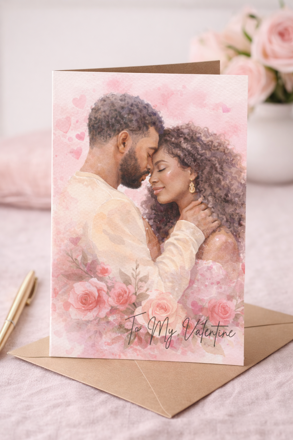 Celebrate love with a card that feels as tender and meaningful as the moment itself. The “To My Valentine” greeting card features a romantic watercolor illustration of a couple in an intimate embrace, surrounded by soft pink hues, delicate hearts, and blooming florals. This design captures warmth, connection, and timeless affection, perfect for expressing love in a heartfelt way.